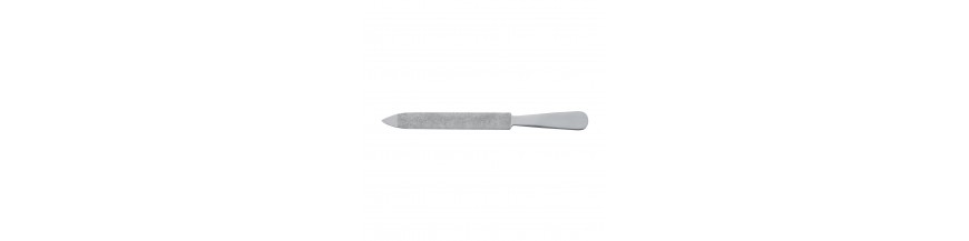 Sapphire nail files are made of elastic, dimensionally-stable spring steel. The tip is usually shaped as a nail cleaner and the edges of the sapphire files are carefully ground after sapphire coating in order to obtain smooth edges without grains. This prevents injuries to the nail bed. One side is coarse for forming the nails, while the other side is fine.